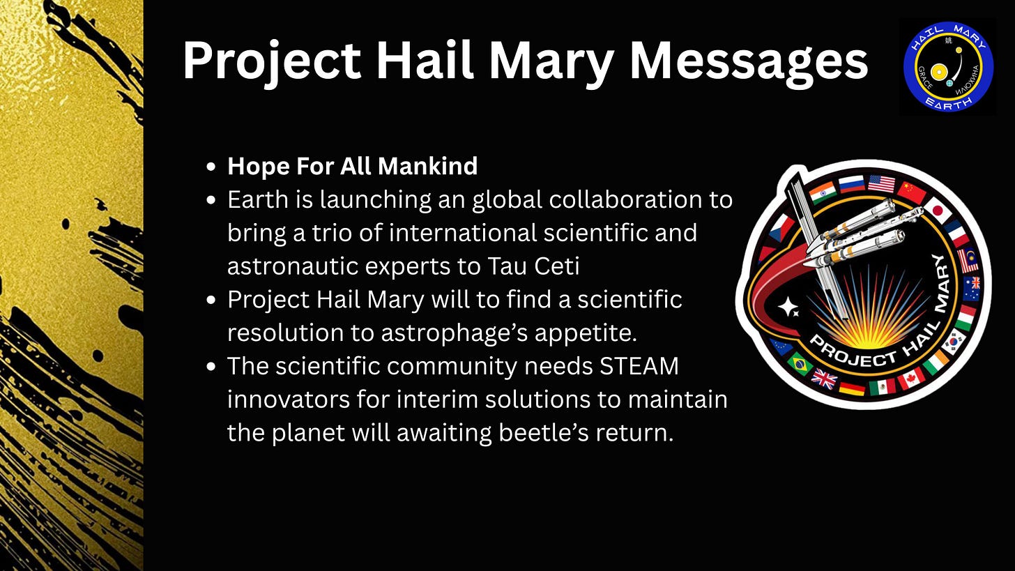 Looking at Project Hail Mary, there are three main points the project needs to communicate with the public: recognizing a planetary crisis, finding a global solution, preparing for the Hail Mary launch, and staying vigilant for the beetles’ return.