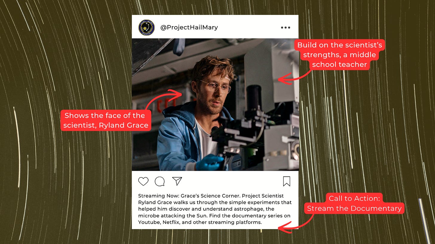 The comms team could ask Dr. Grace to film a series of videos explaining how he discovered astrophage and the mission goals with common experiments. As a beloved middle school teacher with a highly scientific background, Grace would be an excellent subject-matter expert to convey astrophage-related science to the public. The short documentary-style videos could be released in the weeks leading up to the launch, explaining core scientific concepts such as Newtonian and relativistic physics, solar luminosity, and microorganisms in space.